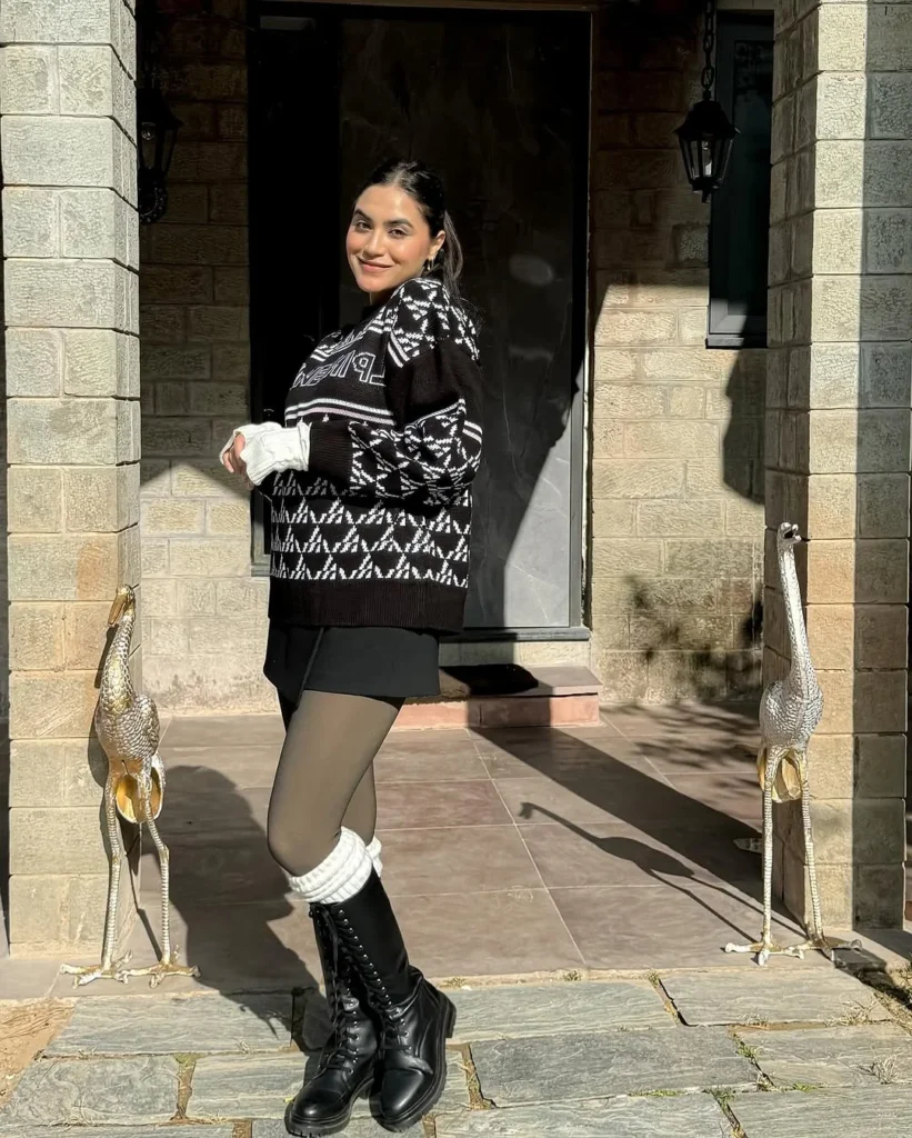Soft tights create a smooth, clean line, and knee-high lace-up boots add strength to the whole look. The white leg warmers bring a cute contrast, making the outfit feel even cozier. Her tied-back hair and gentle smile keep the style natural, showing how easy it is to pair comfort with something chic.