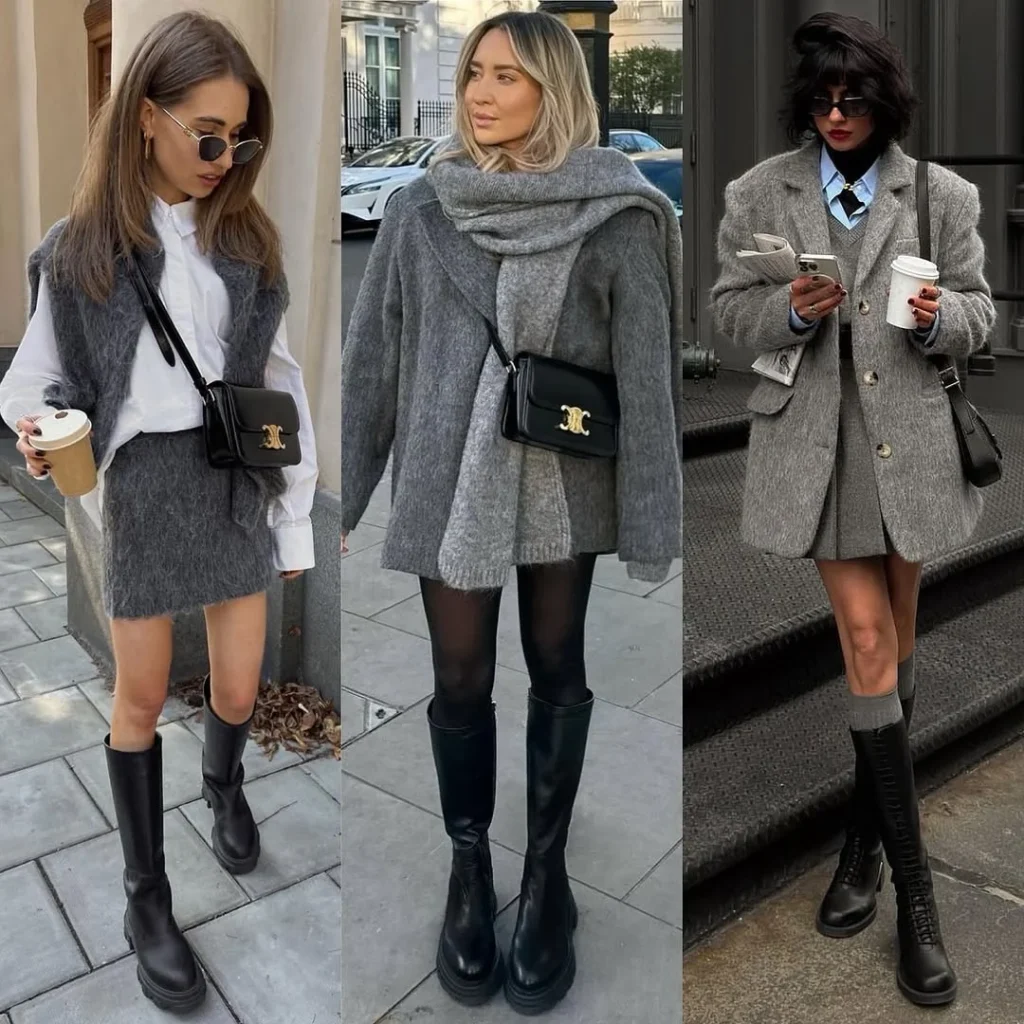 The middle outfit leans into comfort with a chunky oversized sweater and a wrapped scarf, balanced by black tall boots and sheer tights. The last look adds more structure with a tailored coat and pleated mini skirt, giving the outfit a sharp, city-inspired feel.