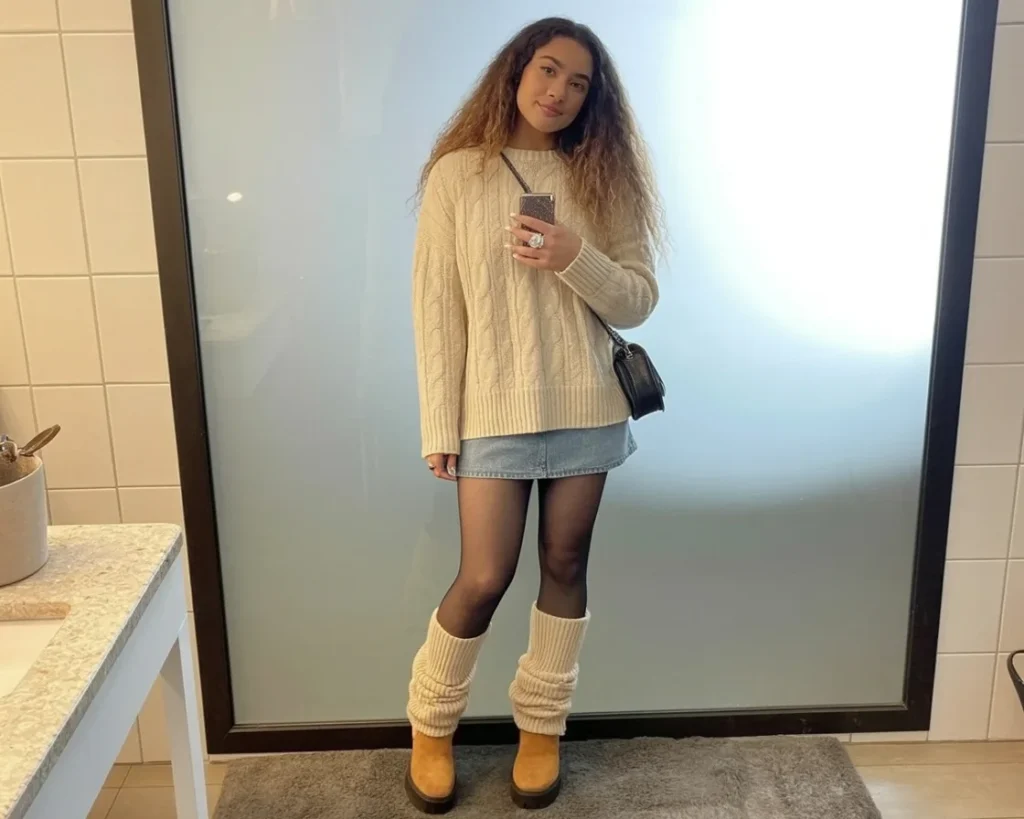 This mini skirt outfit with an oversized sweater brings a soft, cozy charm to cold-weather dressing. The chunky cable-knit top adds warmth and volume, creating a relaxed balance with the fitted denim skirt. Sheer tights give the look a light, feminine touch while keeping the outfit season-ready. Chunky boots paired with slouchy leg warmers add height, texture, and a playful winter twist. A small black shoulder bag completes the style with a clean, everyday finish.