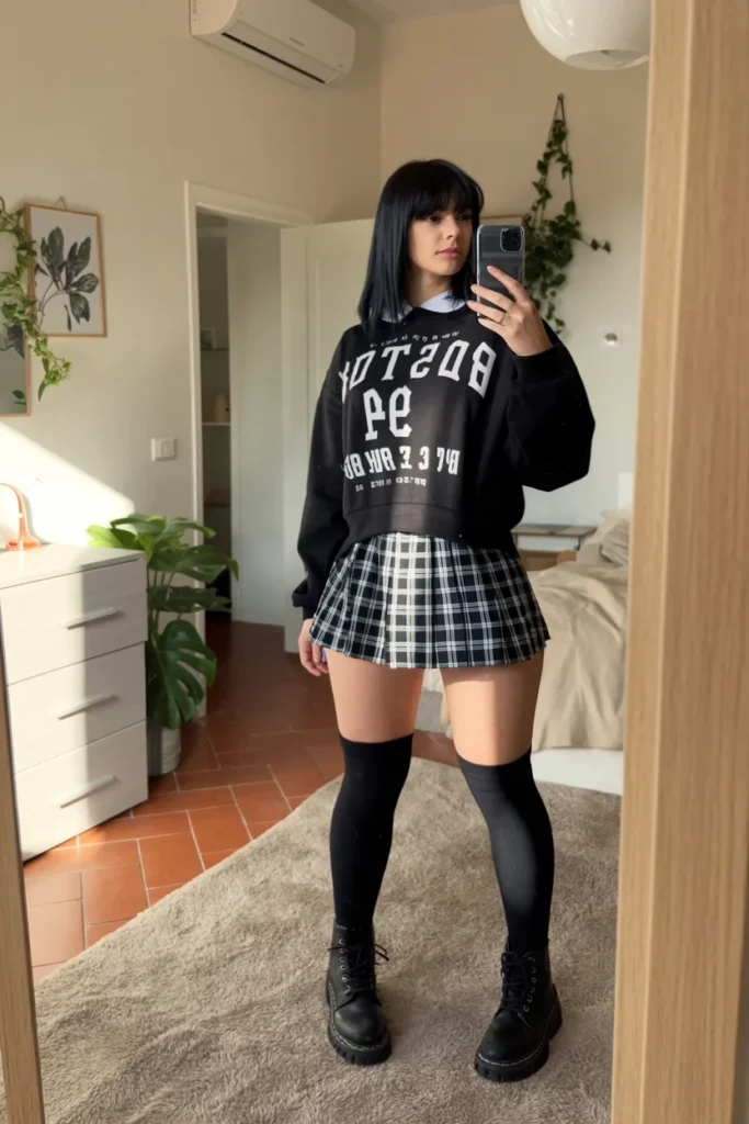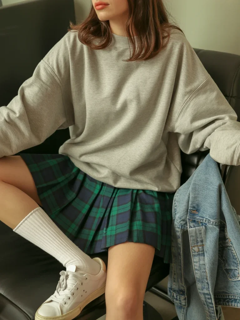 Embrace an academic, relaxed vibe. Use a soft, heather grey oversized sweatshirt as your top. Its broken-in cotton feels familiar and easy. Tuck the front loosely into a pleated, plaid mini skirt. The structured pleats and graphic pattern of the skirt contrast beautifully with the slouchy sweater.