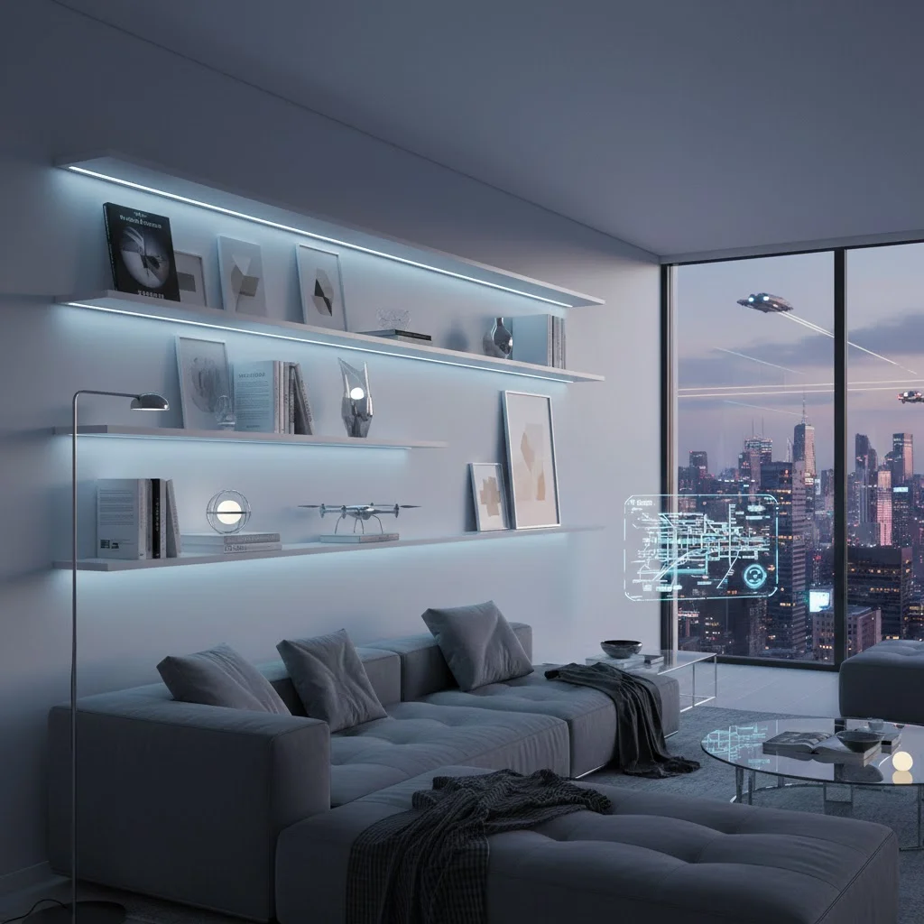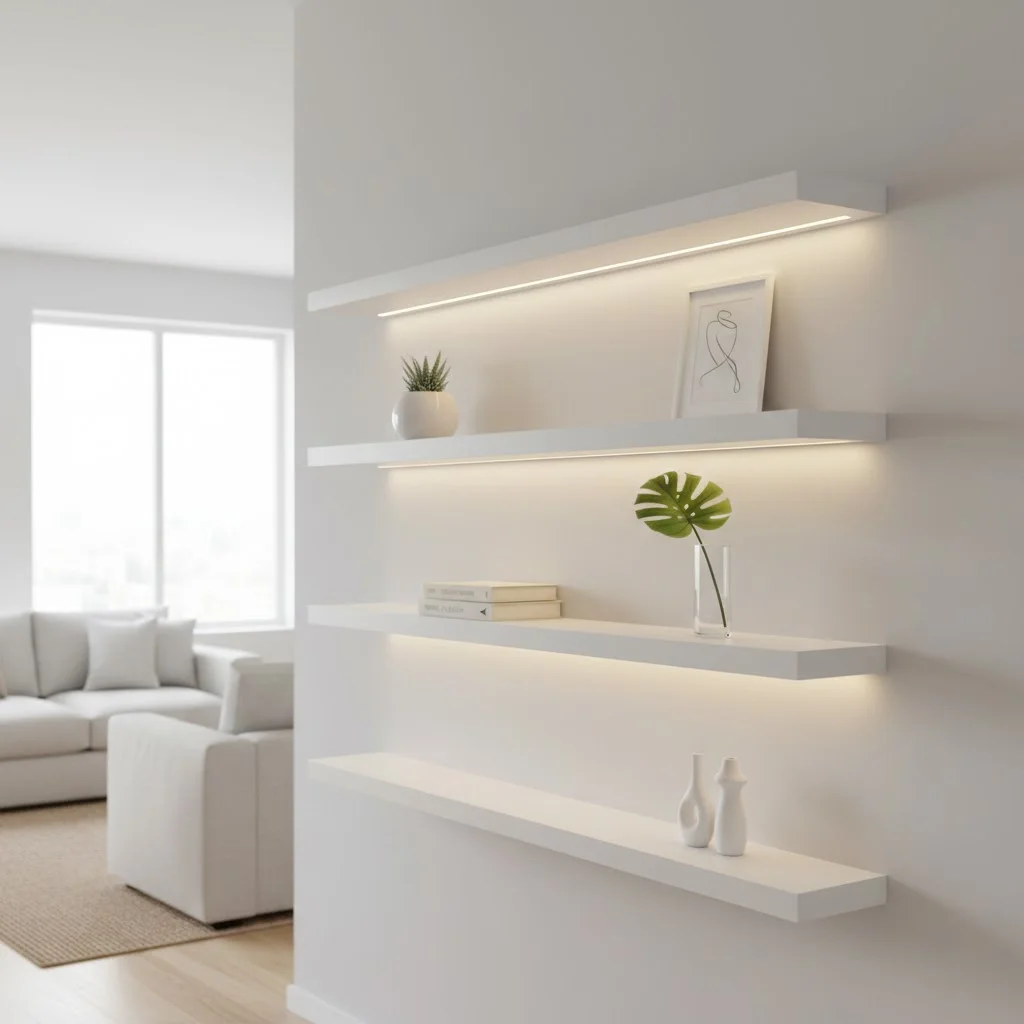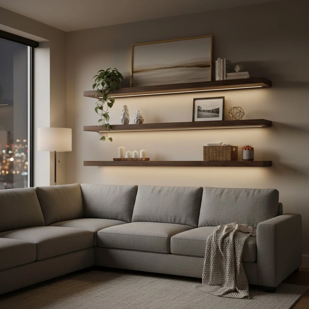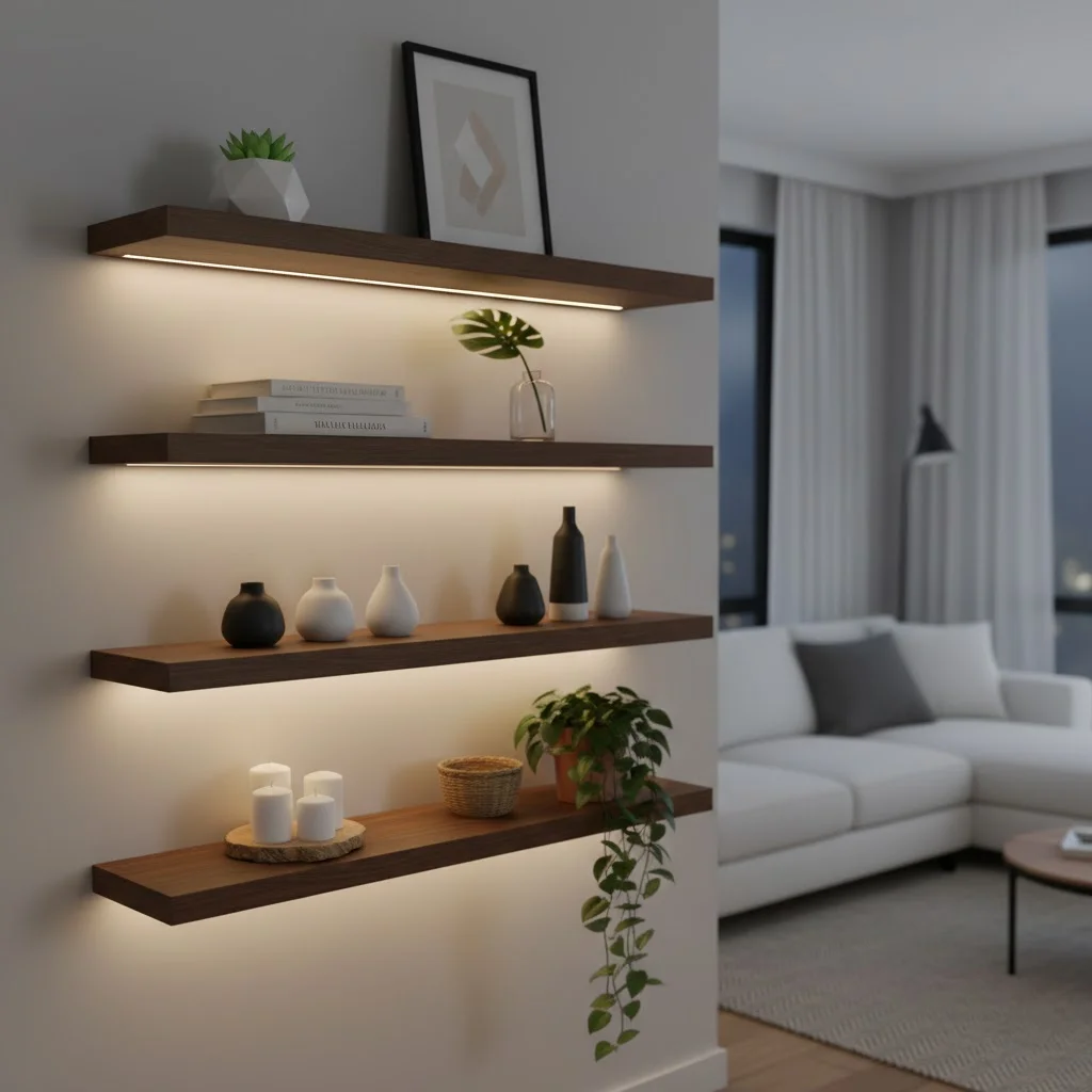 For a more modern, high-tech twist, add LED lighting underneath your floating shelves. This setup not only highlights the items displayed but also adds ambient light to the room, creating a cozy, inviting environment. You can install LED lights along the bottom edge of your floating shelves or within built-in cubby spaces for a dramatic effect.