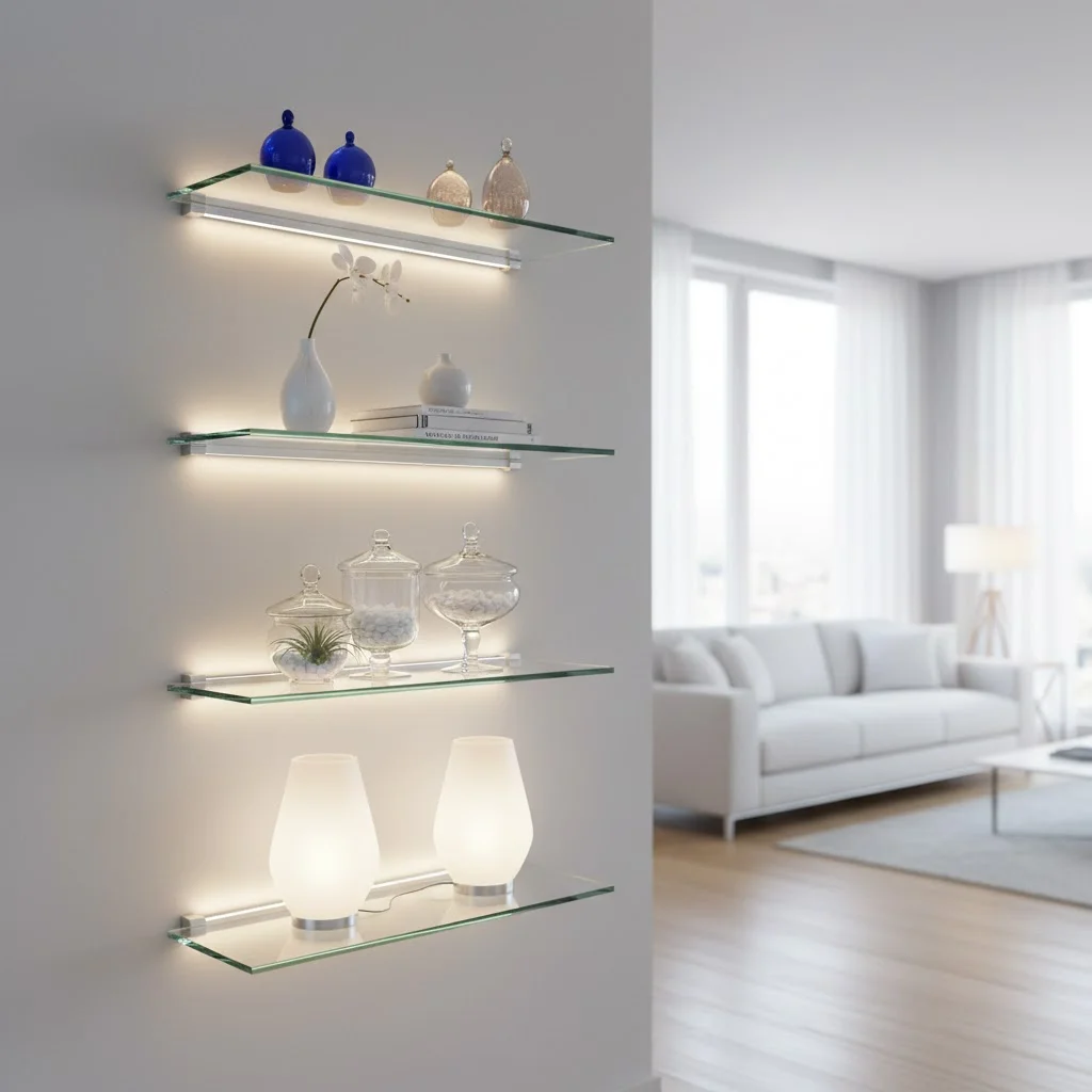 Glass floating shelves provide a sleek, modern, and almost invisible display for your decor. Since the material is transparent, it doesn’t clutter the view and maintains the clean, minimalist aesthetic. Perfect for showcasing glass art, delicate ceramics, or lighting fixtures, these shelves can make a space feel more open and airy.