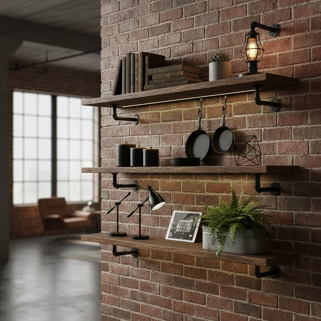 Industrial-style floating shelves blend metal and wood, offering a bold, rustic, and contemporary design. Ideal for modern lofts or urban apartments, these shelves evoke a sense of sophistication and ruggedness. They can be used in the kitchen to hold cookware, in the living room to display books and plants, or even in a home office for a trendy, functional workspace.