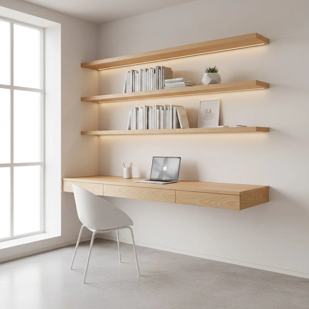 For a minimalist home office or study area, consider installing floating desk shelves. These shelves combine functionality with style by providing storage for your workspace essentials without taking up much room. They can store office supplies, books, and personal items while maintaining a clean, modern aesthetic.