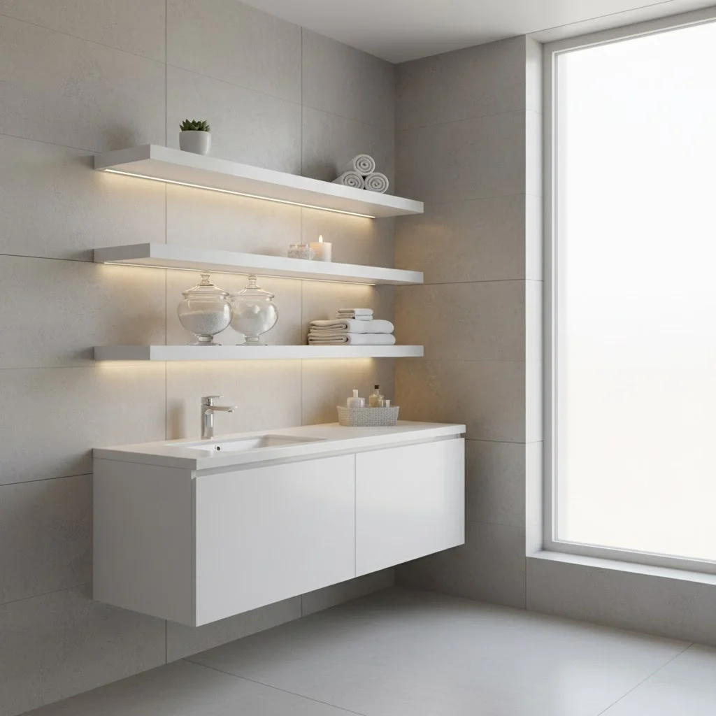 Floating shelves in the bathroom can help keep toiletries organized while adding an elegant touch. They’re perfect for holding towels, candles, decorative jars, or even plants. These shelves save space and reduce the cluttered look that bathrooms can sometimes have, especially in smaller spaces.