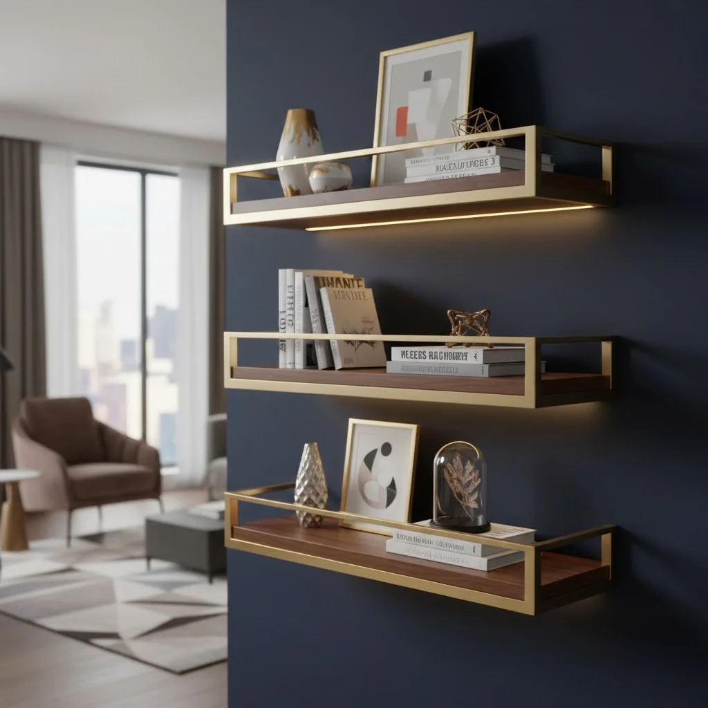 If you’re looking to bring luxury and opulence into your home, gold-accented floating shelves are an excellent option. The gold trim or frame adds a sophisticated, high-end touch, perfect for display areas where you want to showcase statement pieces. These floating shelves look stunning with modern art, decorative vases, and unique sculptures. Use them in a living room or entryway for a touch of glam.