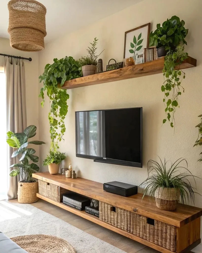 For a stylish and functional living room, consider adding floating shelves to display plants, books, and personal items. These shelves bring a touch of nature into your space, allowing plants to cascade down while providing a clean, minimalist storage solution for your entertainment center. The combination of wood and greenery adds warmth and tranquility to the room, making it a perfect spot for relaxation.