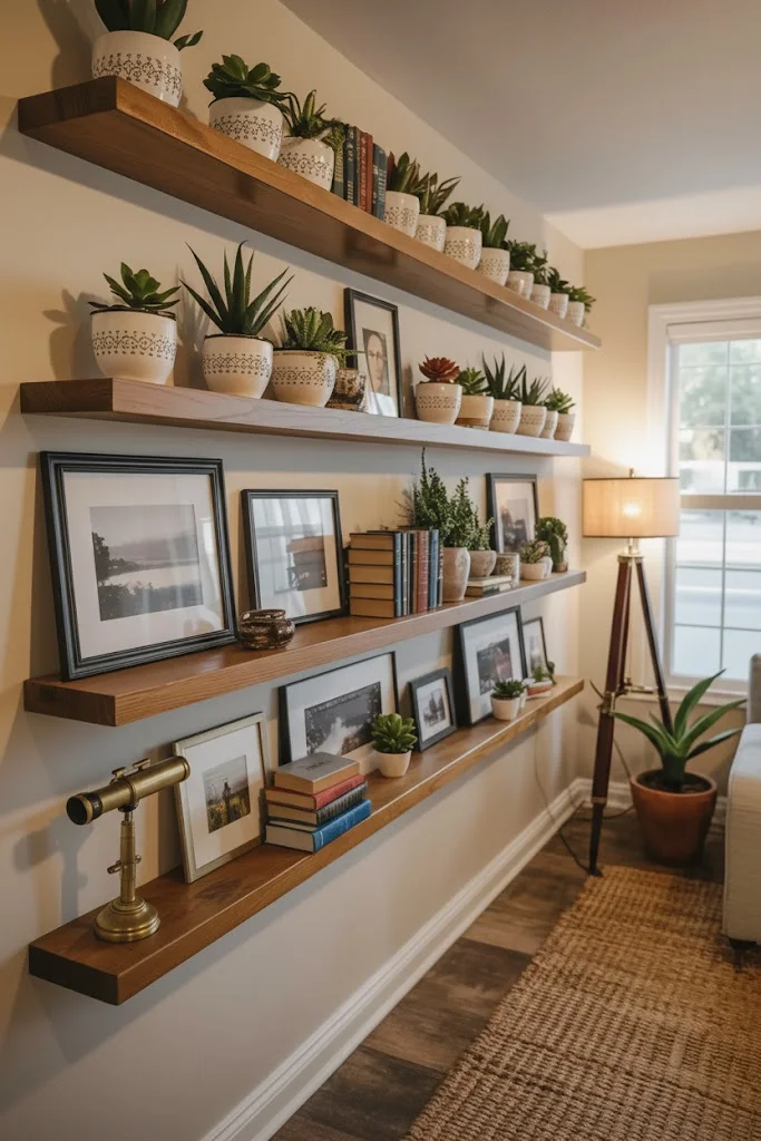 For a chic, contemporary living room or entryway, consider adding floating shelves. These shelves offer a sleek way to display decorative items like candles, plants, or pumpkins while keeping your space uncluttered. The open design not only highlights your favorite pieces but also maintains an airy, open feel in your home.