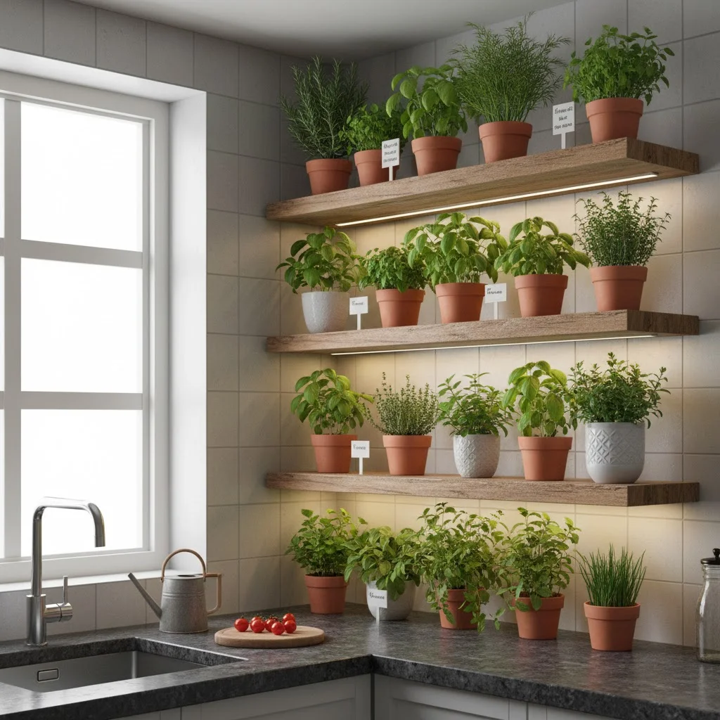 Maximize space in your kitchen by installing floating shelves to grow your herb garden. These shelves offer a space-efficient way to grow fresh herbs like basil, rosemary, and thyme right in your kitchen. The shelves also serve as a unique, organic display in an otherwise practical space.