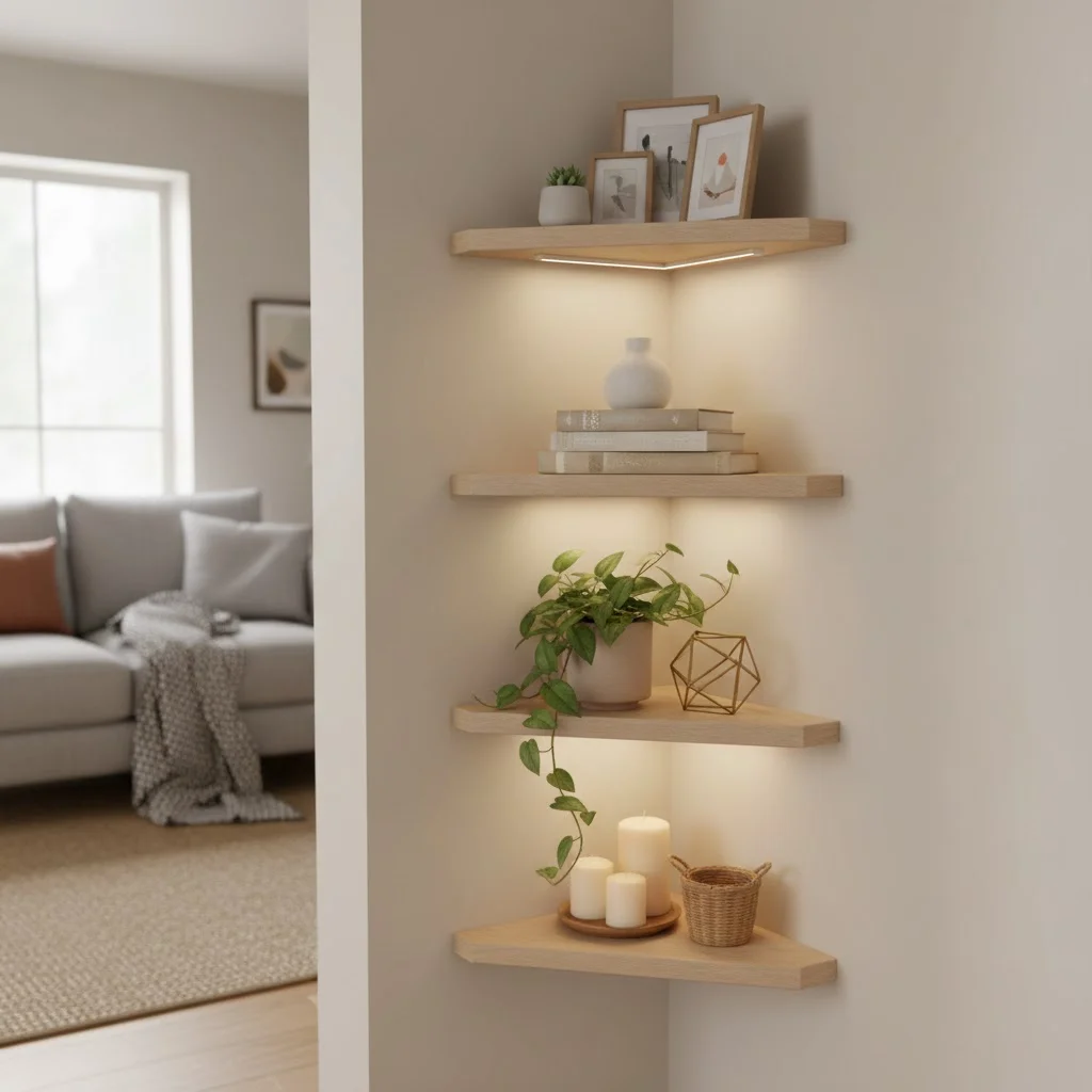 Maximize unused spaces in your home with corner floating shelves. These shelves utilize corners effectively, allowing you to store or display items without occupying too much of the room’s overall space. Install them in living rooms, bedrooms, or kitchens to hold small decor pieces, plants, or other essentials.