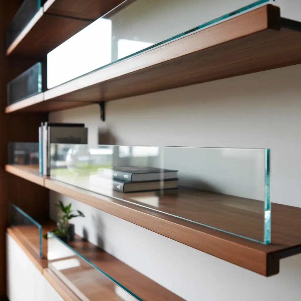 Floating shelves with glass railings are a sophisticated and modern design choice. The glass railing provides a sleek, minimalist aesthetic while keeping the items on display. These shelves are perfect for high-end homes or those looking to achieve an ultra-modern, industrial style.