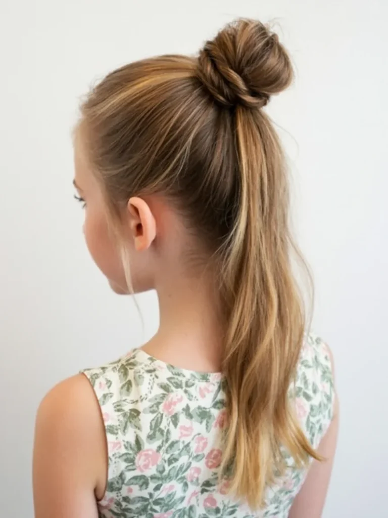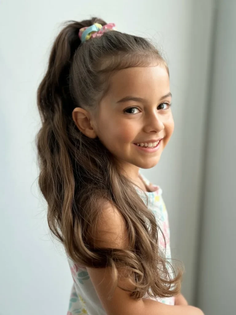 A classic high ponytail is a go-to look for a reason, it’s simple, clean, and always stylish. For this hairstyle, gather the hair at the top of the head and secure it with an elastic band. The high ponytail adds volume and length, making it suitable for any age. Whether you’re running errands, attending school, or heading to a birthday party, this style works wonders. For added fun, try accessorizing with a cute bow or scrunchie.
