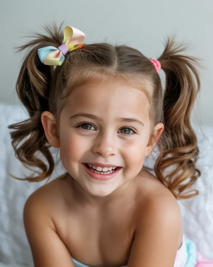 For a playful, youthful vibe, try double ponytails. Part the hair down the middle or slightly to one side, and create two ponytails. Double ponytails are especially great for younger kids as they keep the hair out of the face and prevent it from tangling during playtime. Add a fun bow or colored elastic to each ponytail to personalize the look.