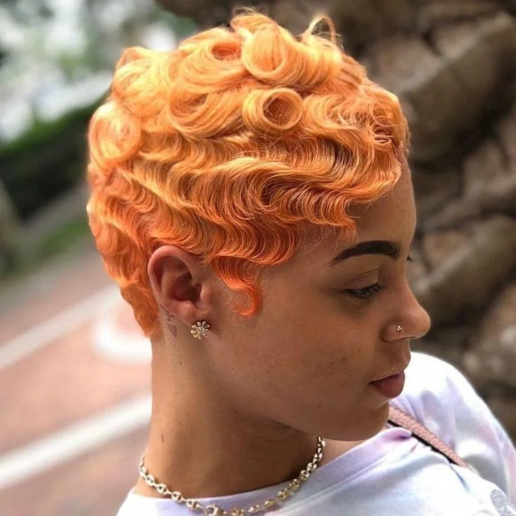 A vibrant finger wave pixie like this brings bold color and sculpted texture together, creating one of the most striking short hairstyles for Black women. Soft, defined waves sit close to the scalp, flowing in smooth patterns that highlight the shape of the cut. The bright orange shade adds energy and warmth, giving the style a playful edge while still looking polished. Small curls at the crown add dimension, making the look feel lively from every angle.