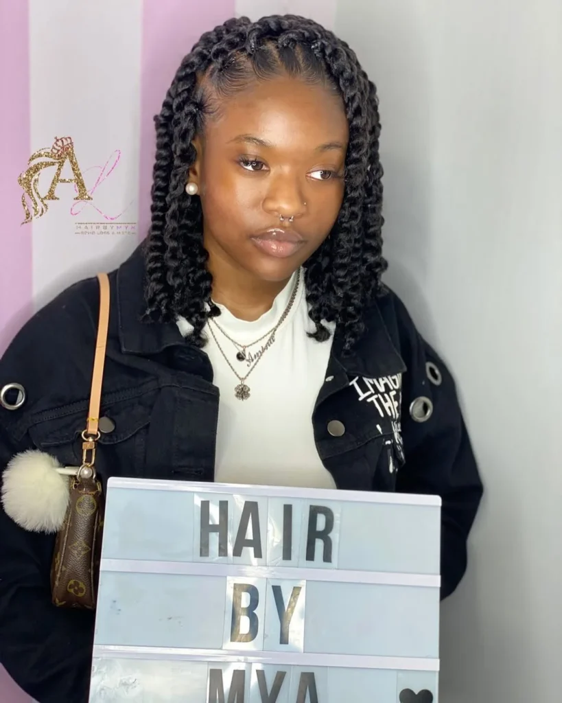 Her simple accessories and casual outfit keep the focus on the hairstyle’s texture and craftsmanship. The look feels easygoing yet put-together, which makes it great for everyday wear or a casual outing. This twist bob is ideal for women who want a short protective style that celebrates natural beauty, offers versatility, and stays stylish with minimal effort.
