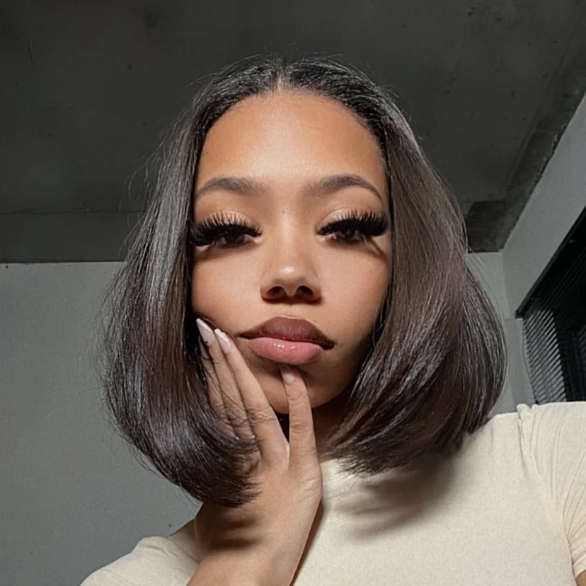Long lashes and natural makeup enhance the beauty of the hairstyle without overshadowing it. The rounded shape creates a subtle volume that flatters the face and highlights the jawline. This bob is a great choice for women who want something easy to maintain but still full of style, offering a chic look that works for both casual days and dressed-up moments.