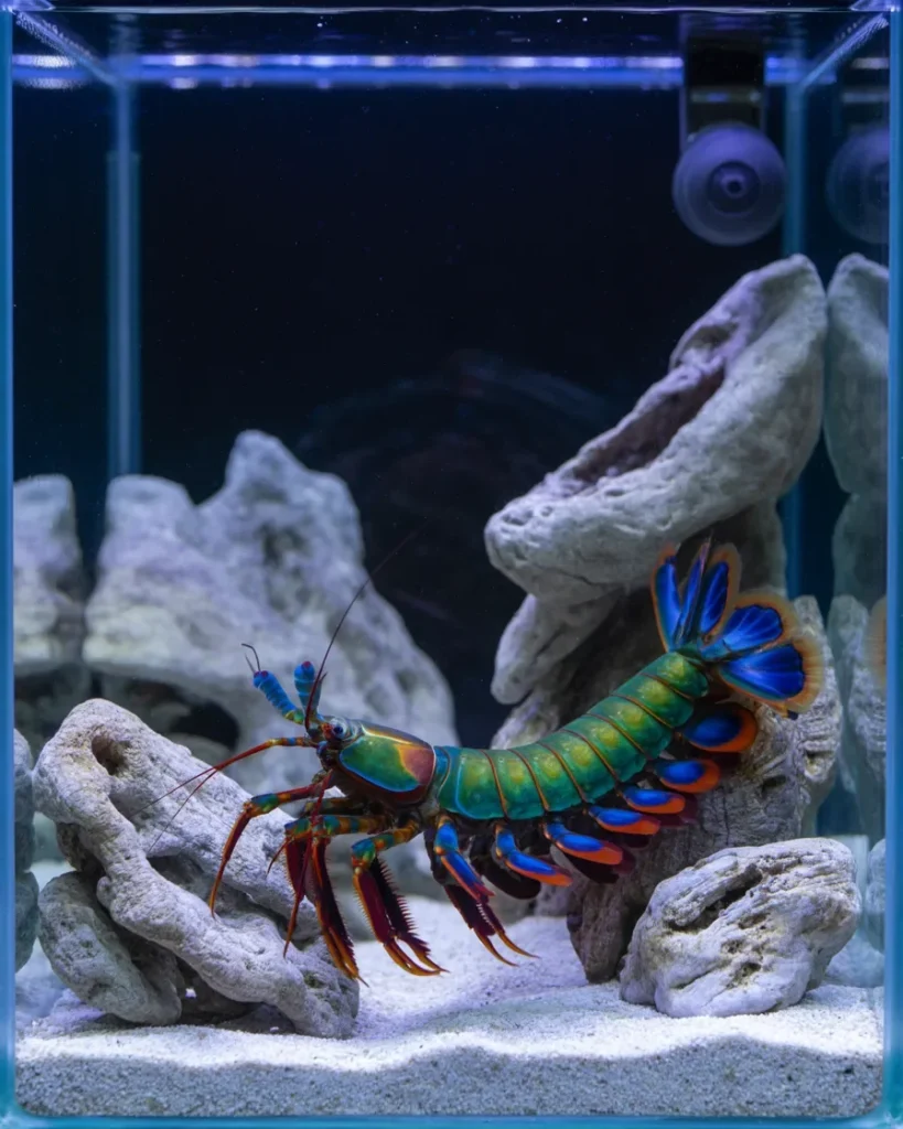 A colorful mantis shrimp steals the spotlight in this dynamic tank setup. Its brilliant hues of green, blue, and red create a striking contrast against the pale rocks and sandy substrate.