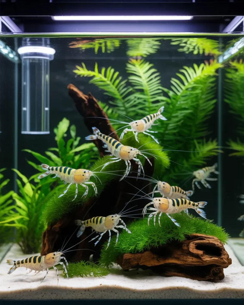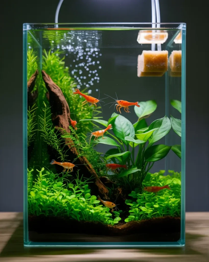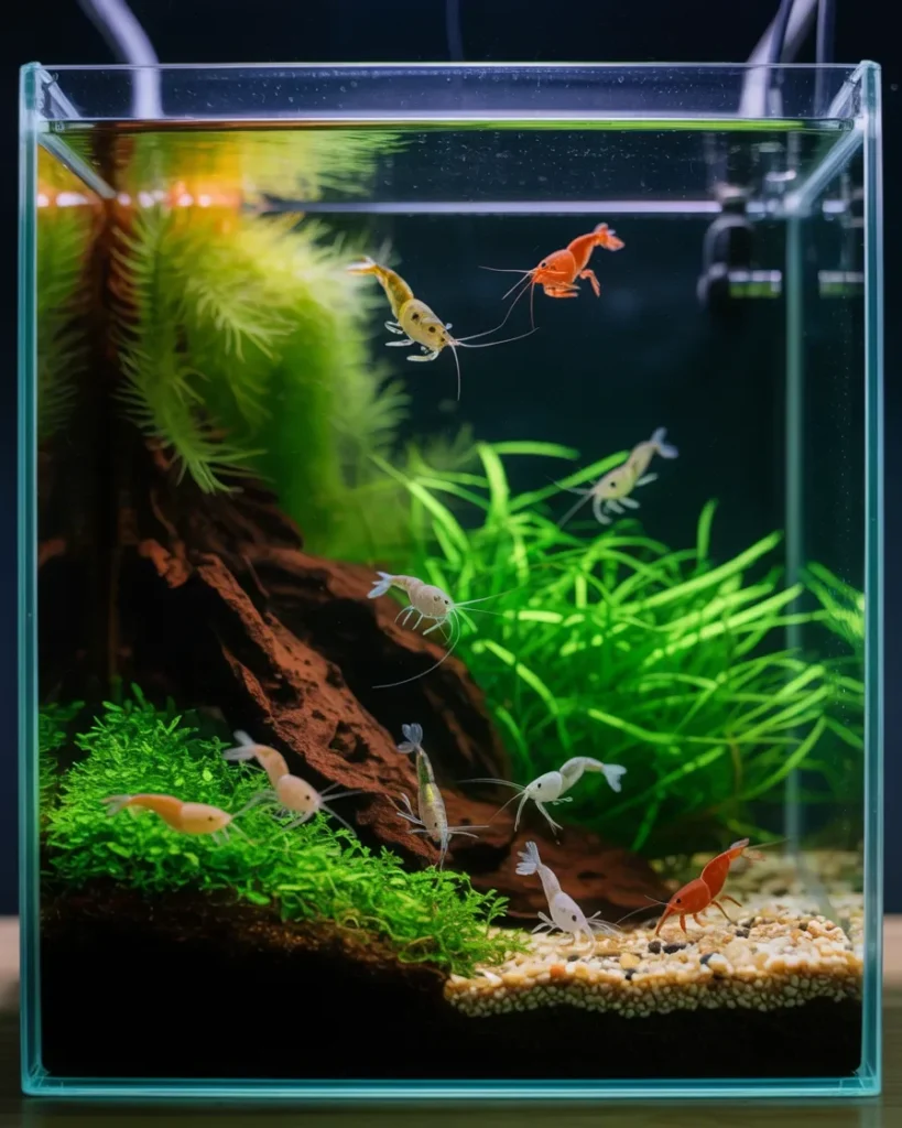 A soft, overhead light adds a gentle glow, highlighting the natural beauty of the setup. This design provides both a thriving environment for shrimp and a visually appealing centerpiece.