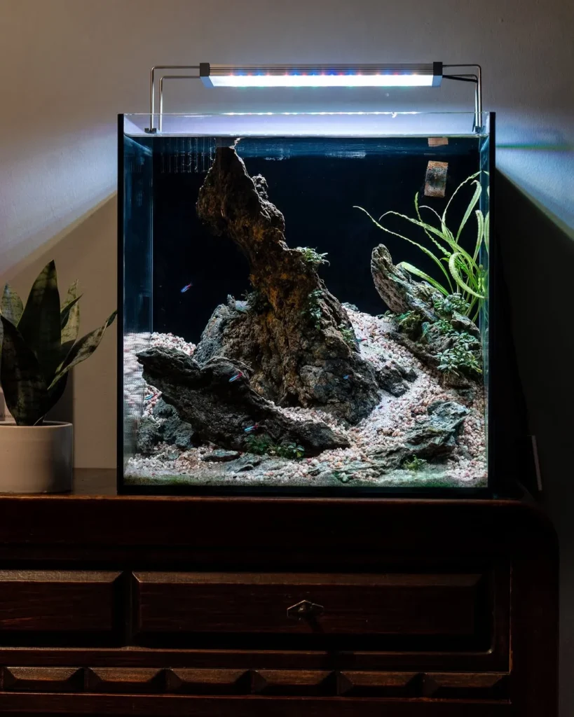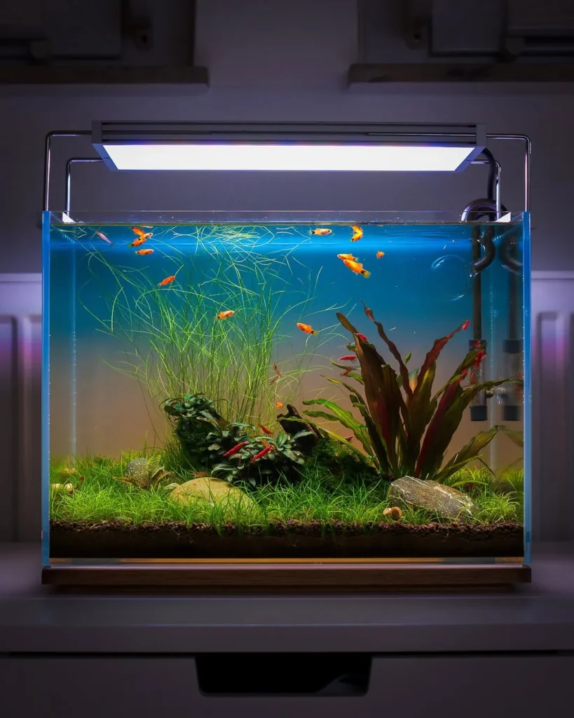 With simple yet effective aquascaping, this tank thrives on natural beauty. The plants add life, while the lighting showcases the tank’s contents, creating a peaceful, inviting scene.