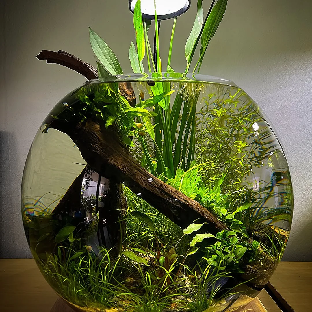 The soft curves of this round aquarium give it a unique, serene look, blending nature with modern design. Lush plants and rustic driftwood create a tranquil environment, ideal for shrimp to explore and hide.