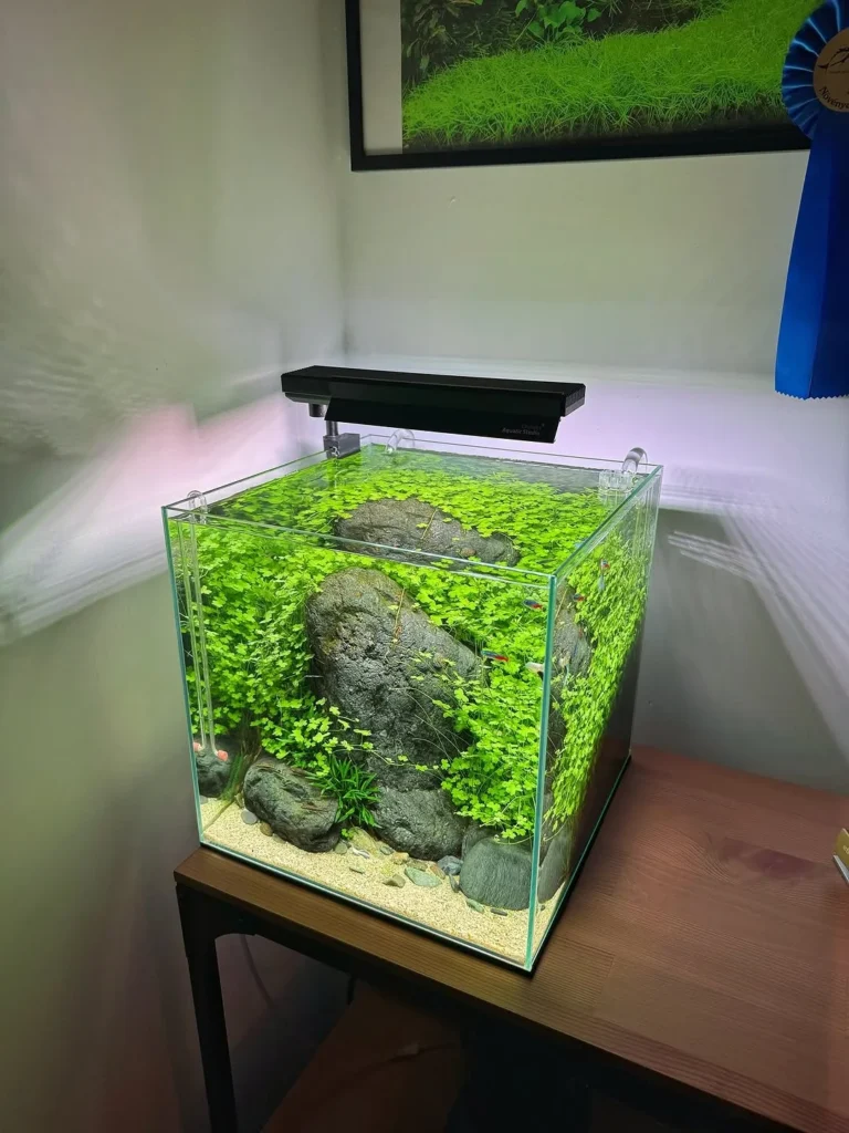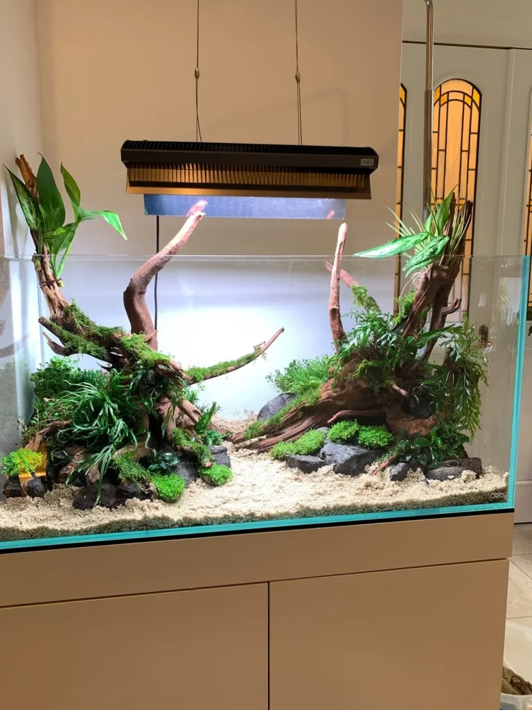 With gentle lighting above, the plants thrive while the shrimp enjoy a peaceful, balanced environment. This tank brings a harmonious blend of nature and design, offering a beautiful habitat for aquatic life.