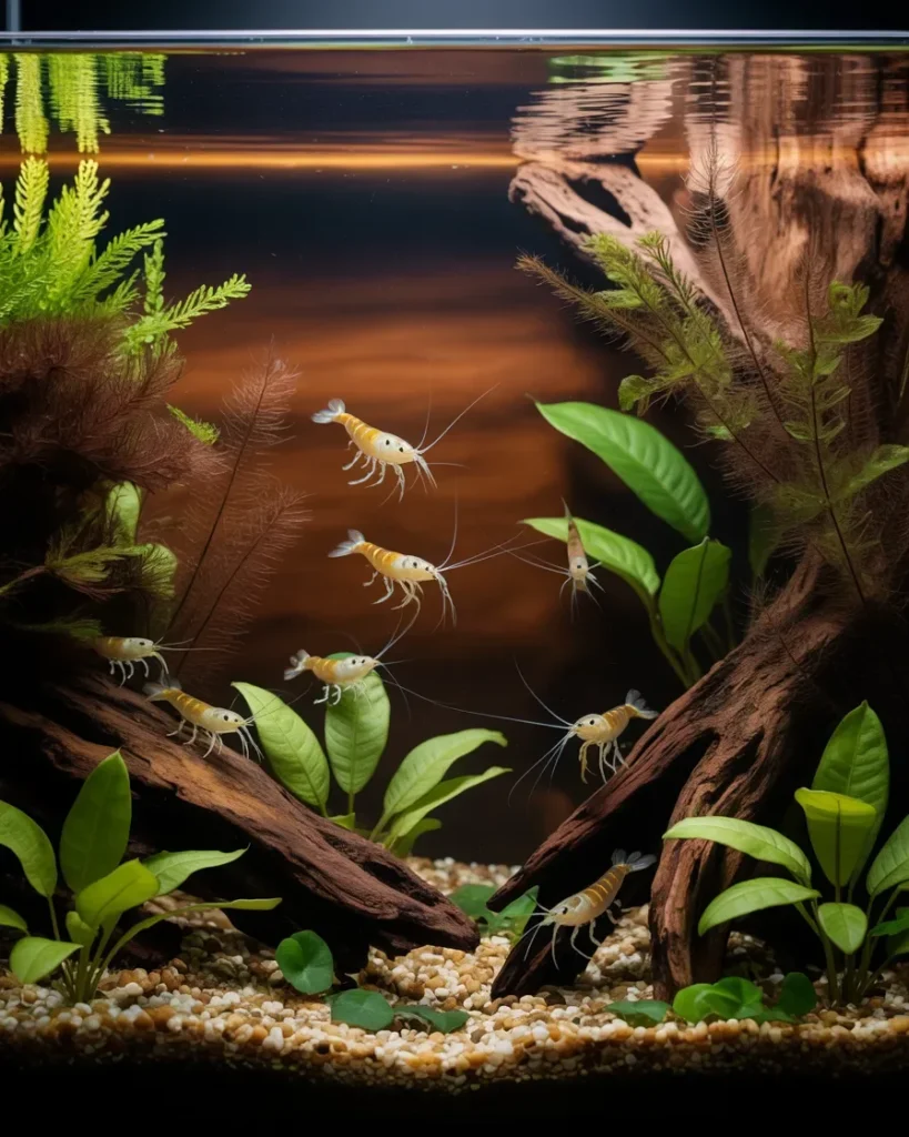 The tank’s lush plants add vibrant green shades, contrasting beautifully with the pale shrimp. Driftwood elements provide texture, while the sandy substrate maintains a clean, minimalistic look that lets the shrimp and plants shine.