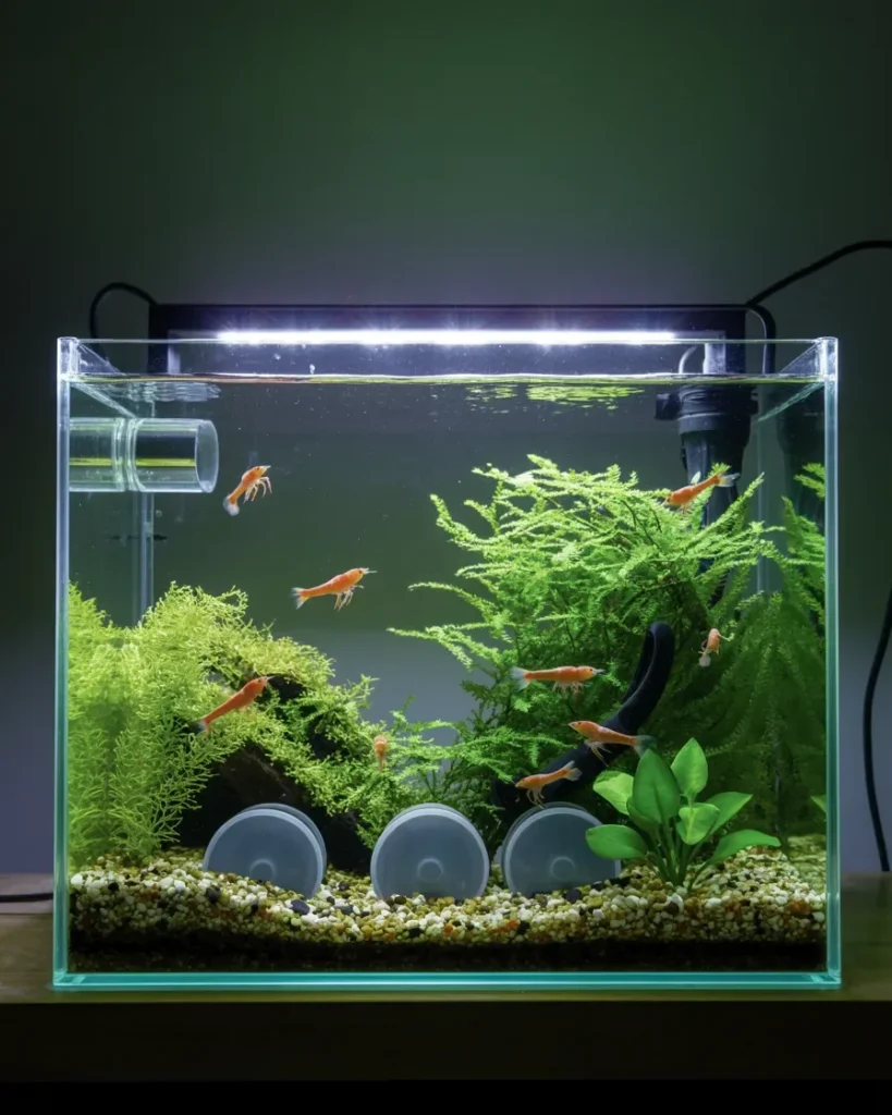A gentle water flow keeps the setup peaceful, while the light highlights the shrimp’s beauty. This shrimp tank is not just a habitat; it’s a calming, aesthetic centerpiece for any room.
