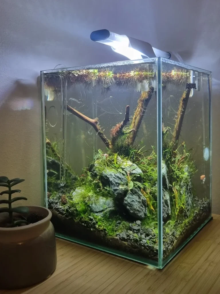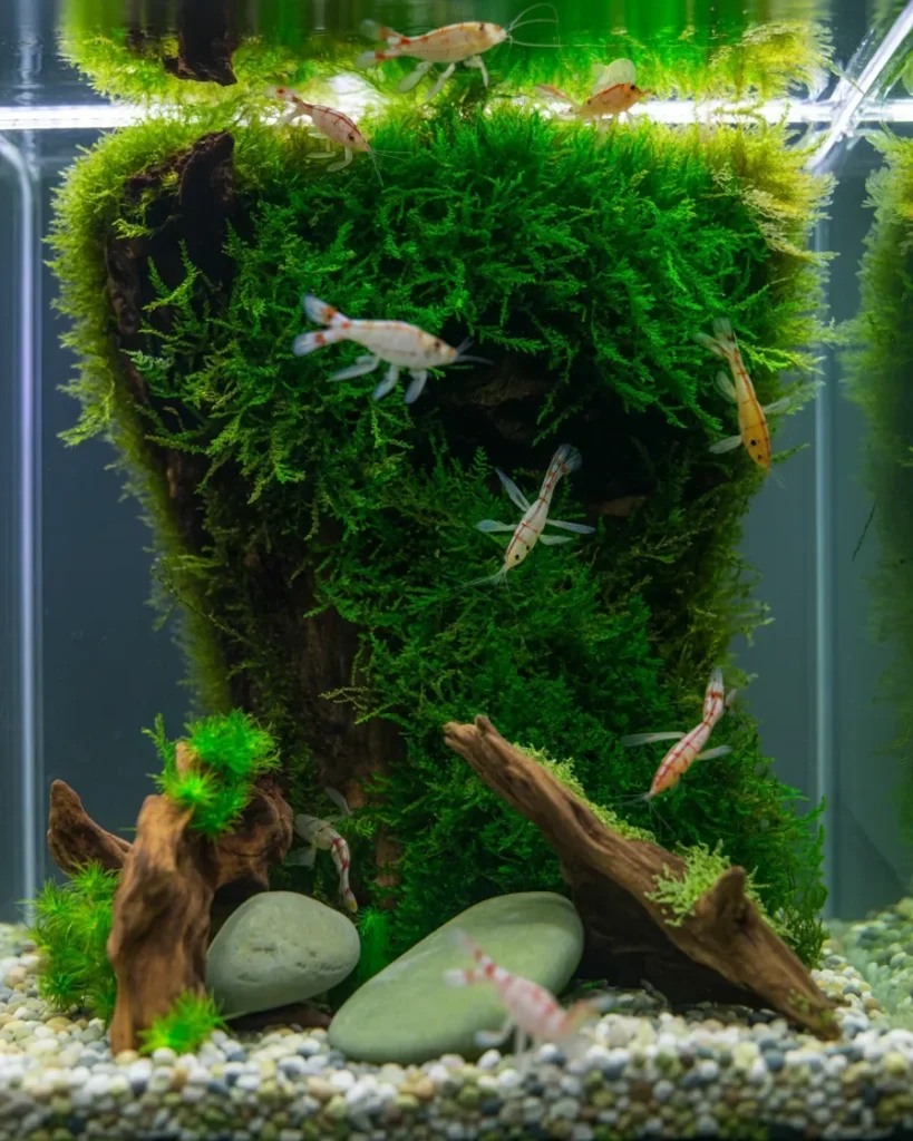 This shrimp tank showcases a beautifully arranged aquascape with moss-covered driftwood and scattered rocks. The contrasting textures create a dynamic, natural environment that draws the eye.