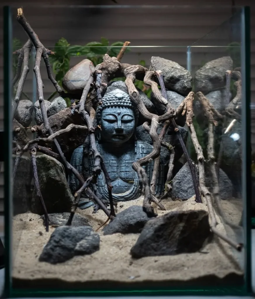 A Buddha statue surrounded by rocks and delicate twigs offers a peaceful focal point in this shrimp tank. The natural elements create a serene, minimalist environment, allowing the shrimp to move freely.