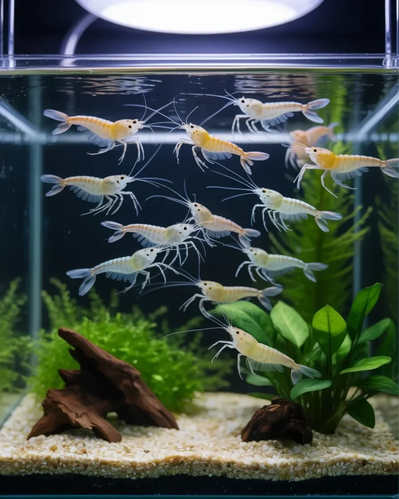 A group of delicate shrimp swims gracefully, their soft, translucent bodies moving through the water. The light from above highlights their gentle, fluid movements, creating a mesmerizing scene.