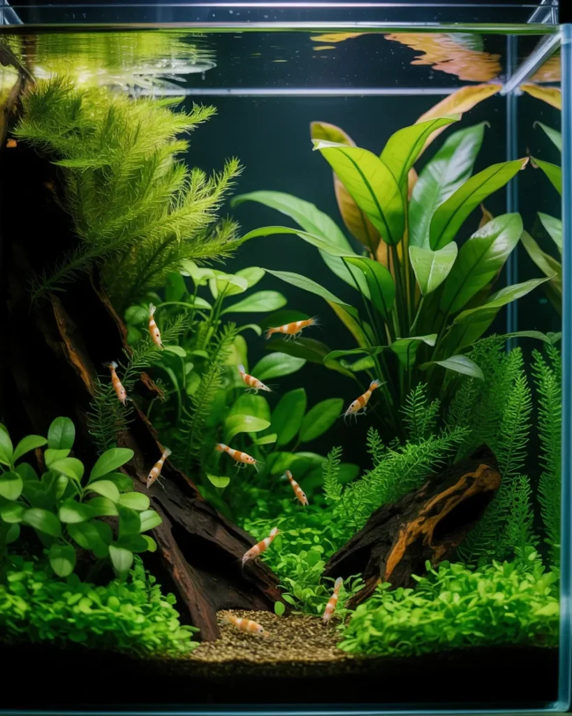 Soft lighting from above enhances the vibrant plants and creates gentle reflections across the water. The varied textures give the tank a dynamic yet peaceful look, allowing the shrimp to explore with ease.