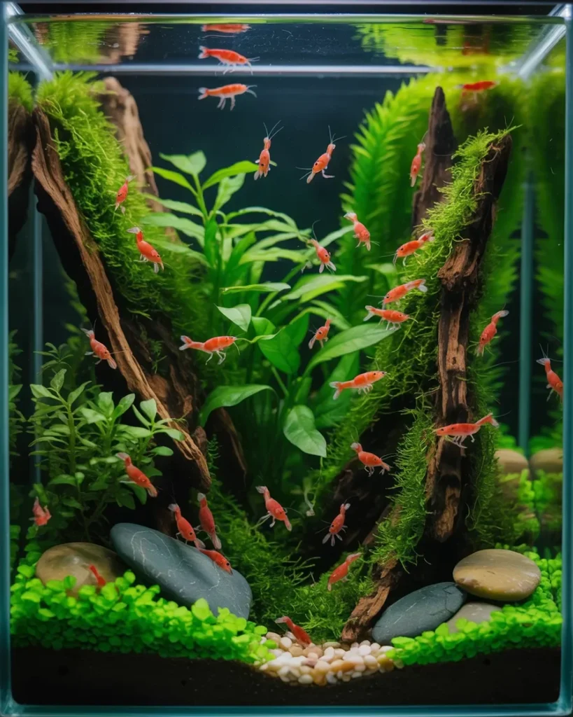 Create a calming environment for your shrimp with lush greenery and smooth rocks. The combination of natural elements not only enhances the aesthetic but also provides hiding spots for your shrimp to explore.