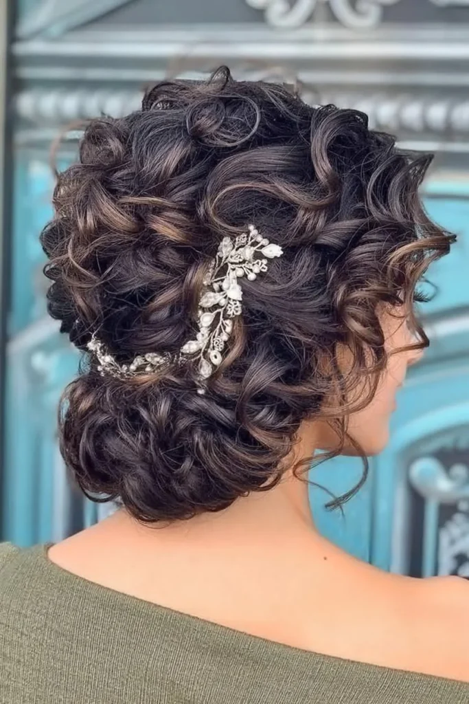 The combination of bouncy curls and a structured updo adds dimension and texture, creating a beautifully balanced look.
