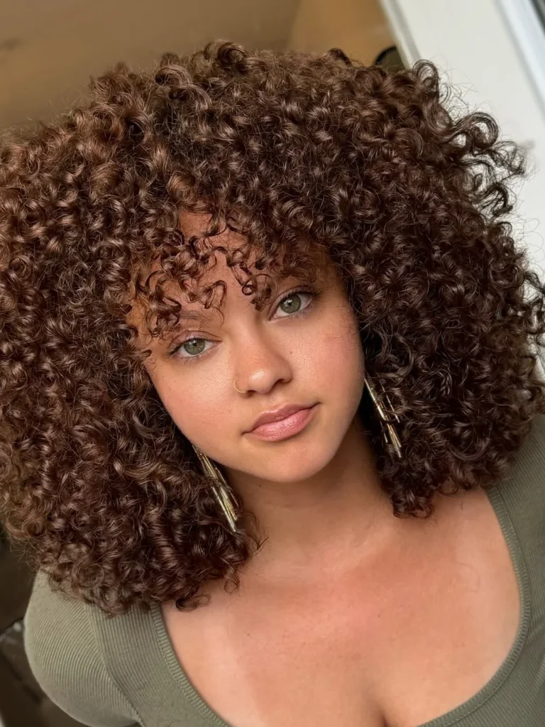 The rich warm tones blend seamlessly with the curls, enhancing their depth and dimension, making the hairstyle look even more dynamic and vibrant.