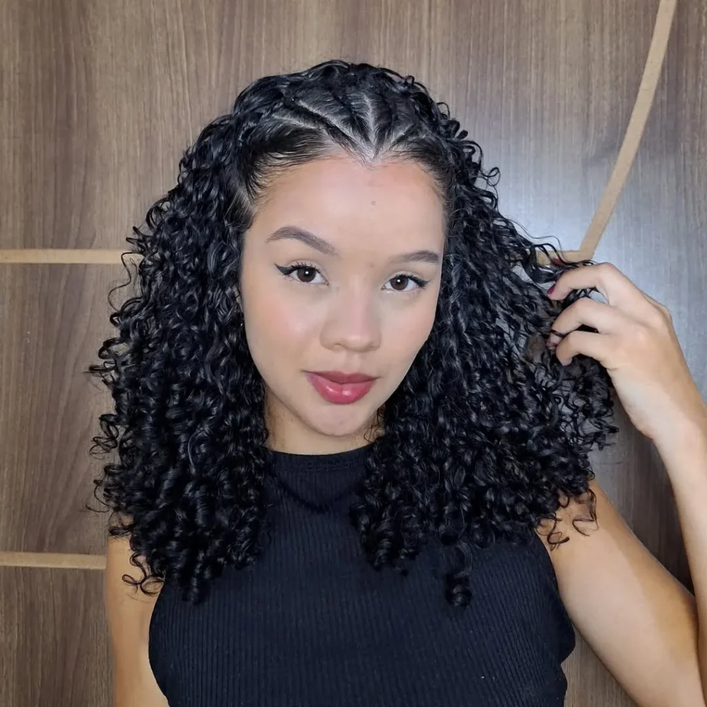 This simple curly hairstyle radiates confidence with a playful touch. Tight braids run along the hairline, framing the face, while the rest of the curls fall in natural, voluminous waves.