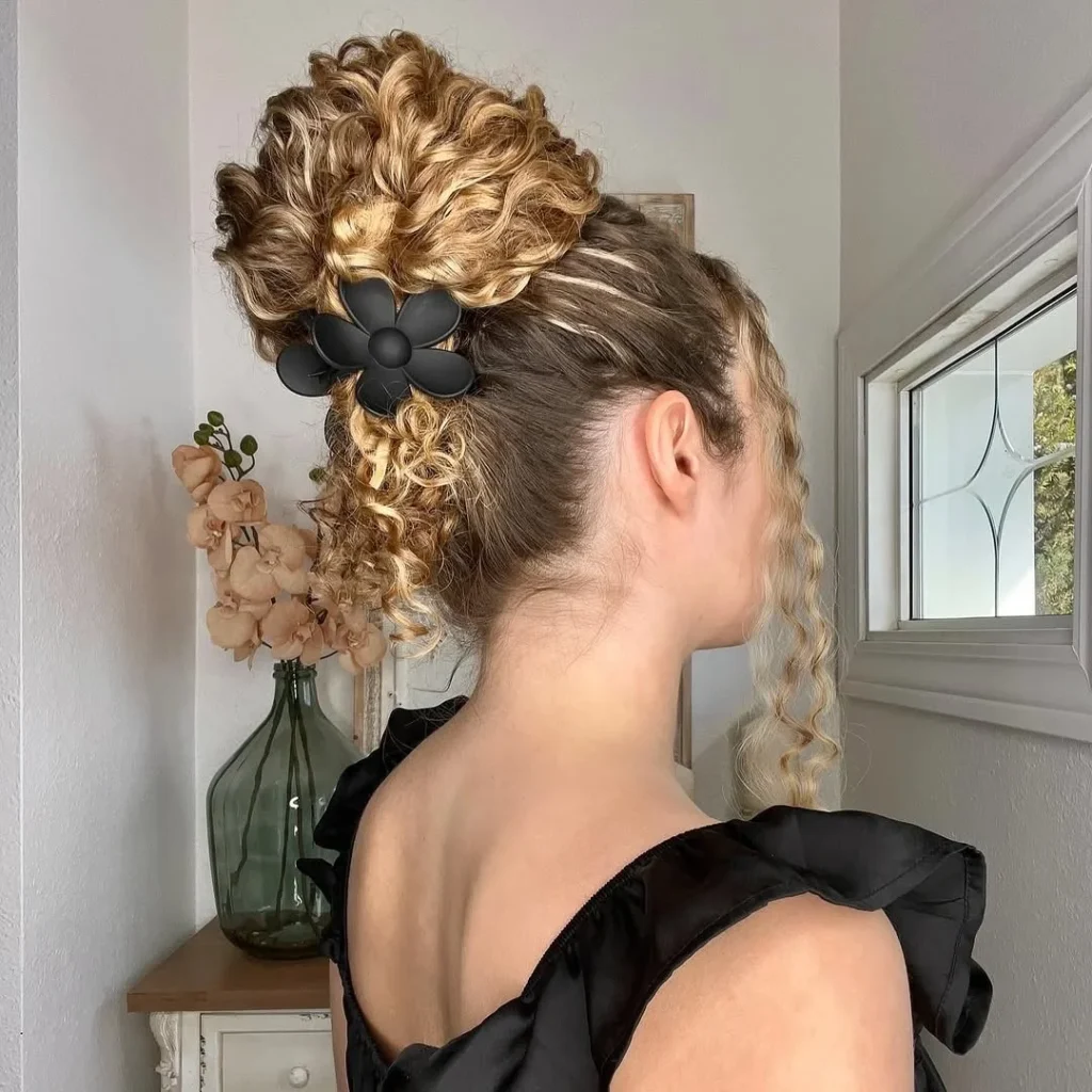 This voluminous curly top knot adds an effortlessly chic touch to your hairstyle. The curls are gathered high at the crown and secured with a stylish flower clip, which brings both texture and flair.