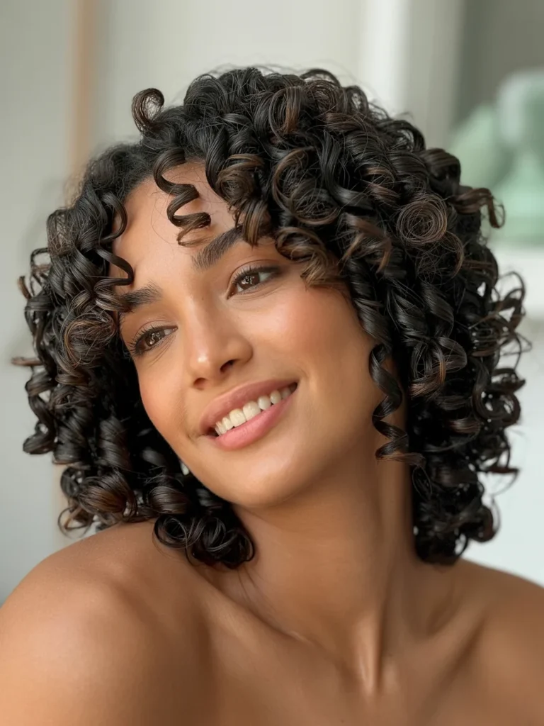 The curls fall naturally around the face, enhancing facial features while providing a youthful, radiant vibe.