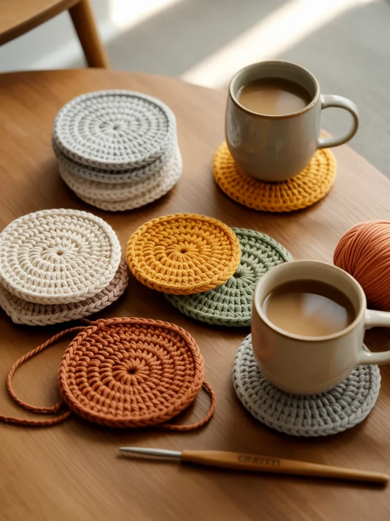 Nearby coffee mugs demonstrate how useful these coasters are in daily life, protecting surfaces while adding style. Neutral tones blend easily with modern and rustic homes, while richer colors bring subtle personality. A crochet hook and yarn placed nearby hint at the creative process behind each coaster.