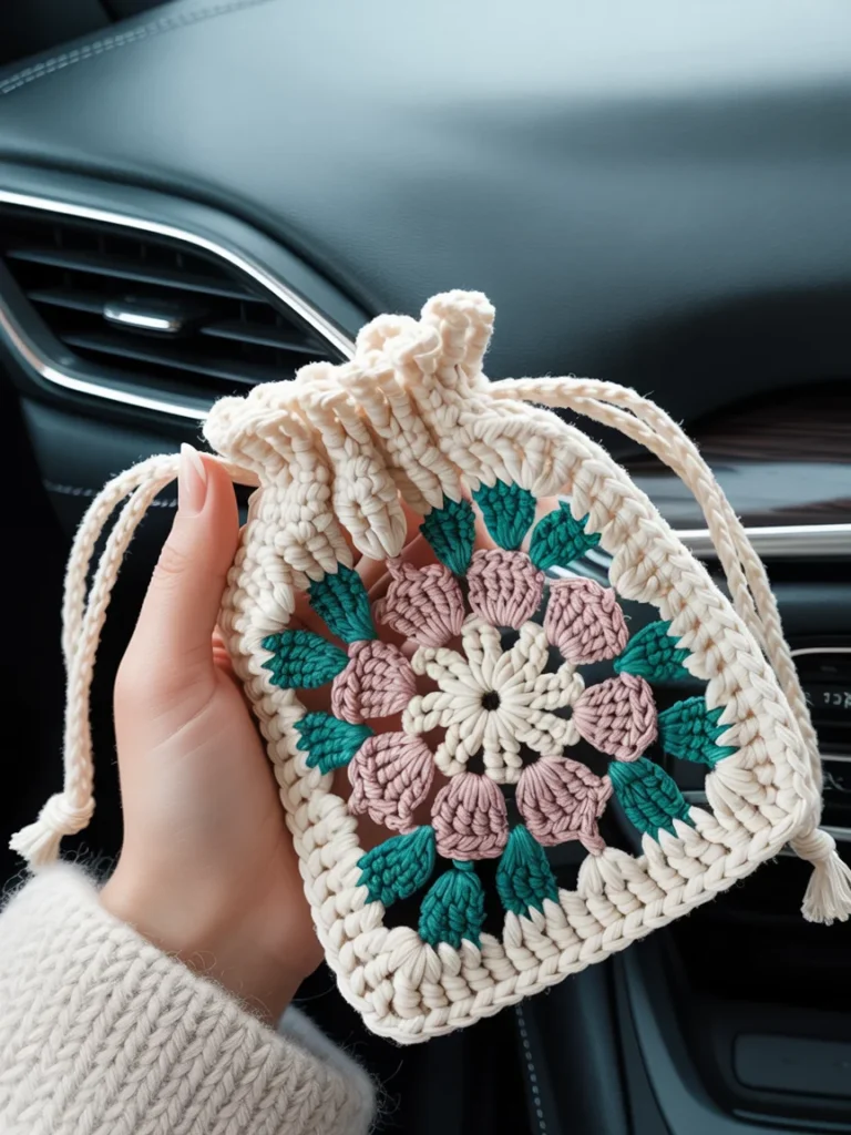 A small crochet drawstring pouch sits comfortably in hand, showing off detailed stitching and a floral granny square design. Soft cream yarn frames the center, while muted pink and green accents bring a gentle pop of color.