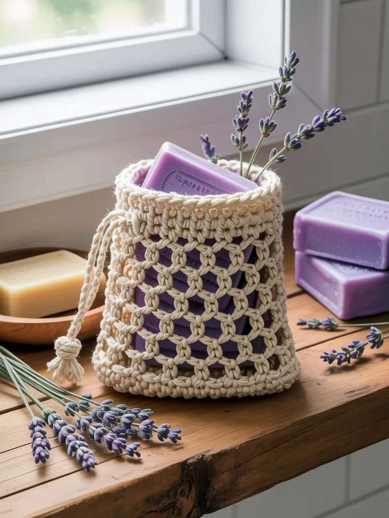 A crochet soap saver pouch rests on a wooden surface, filled with lavender soap and soft floral accents. Natural cotton yarn creates an airy texture that allows soap to dry between uses. Gentle gaps in the pattern help reduce waste while adding a handmade look. Light colors and simple stitching give it a calm, spa inspired feel. Nearby soaps and dried lavender enhance the sense of everyday self care.
