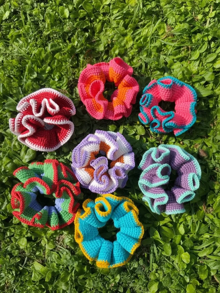 Crochet hair scrunchies bring color and texture to small crochet gift ideas. Bright yarn shades create a playful look that feels cheerful and handmade. Each scrunchie stretches easily while staying gentle on hair during daily wear.