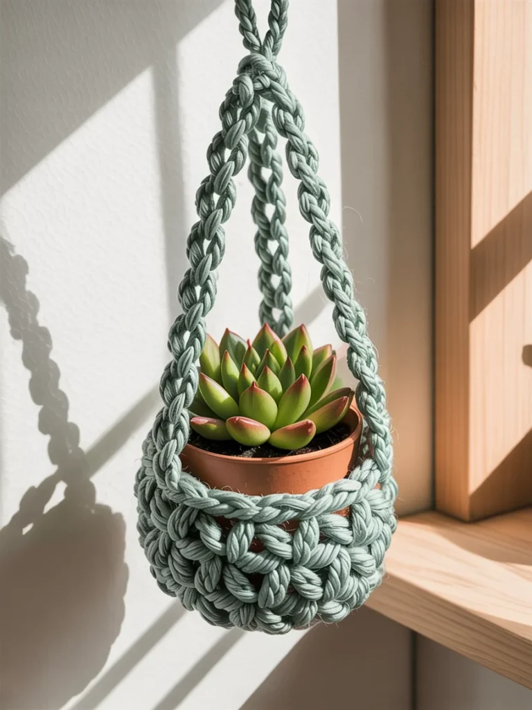 Sunlight softly highlights this mini crochet plant hanger, creating a calm and welcoming mood that fits beautifully into small living spaces. Crafted with thick braided yarn, the hanger shows clear stitch definition that adds texture and character.