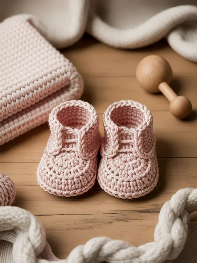 Soft pink crochet baby booties rest gently on a warm wooden surface, creating a calm and comforting scene. Careful stitching forms a snug shape that looks cozy for tiny feet. Delicate straps add charm while helping the booties stay in place during wear.