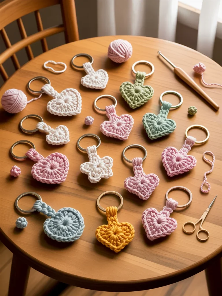 These mini crochet keychains showcase how small crochet gift ideas can be both charming and useful. Arranged neatly on a wooden table, each piece features soft yarn shapes like hearts, stars, and circles in gentle pastel and earthy tones. Handcrafted textures stand out, giving every keychain a warm, handmade feel.