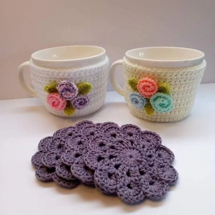 Crochet mug cozies paired with matching coasters make charming additions to small crochet gift ideas. Soft yarn wraps around the cups, helping keep drinks warm while adding a handmade touch. Colorful crochet flowers bring a cheerful look that feels thoughtful and personal.