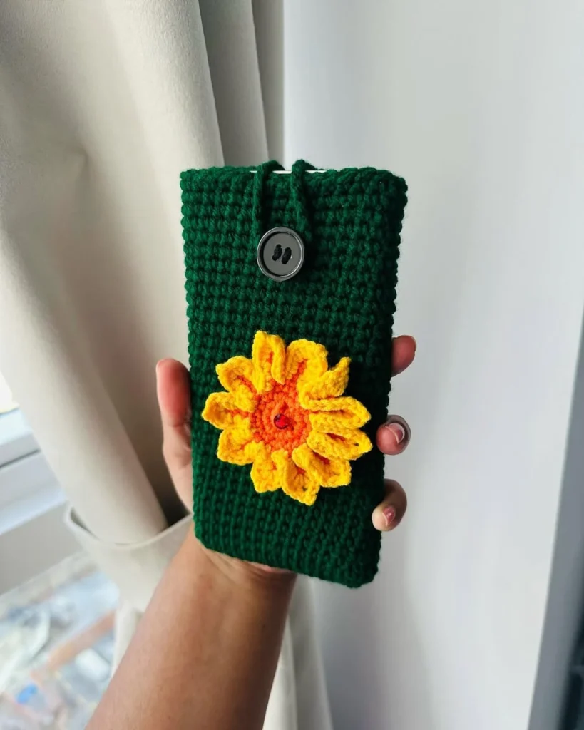 This handmade crochet phone sleeve shows how small crochet gift ideas can still feel thoughtful and useful. Soft green yarn creates a sturdy cover that helps protect a phone from scratches while adding a cozy texture. At the center, a bright sunflower design brings warmth and charm, making the piece feel cheerful and personal.