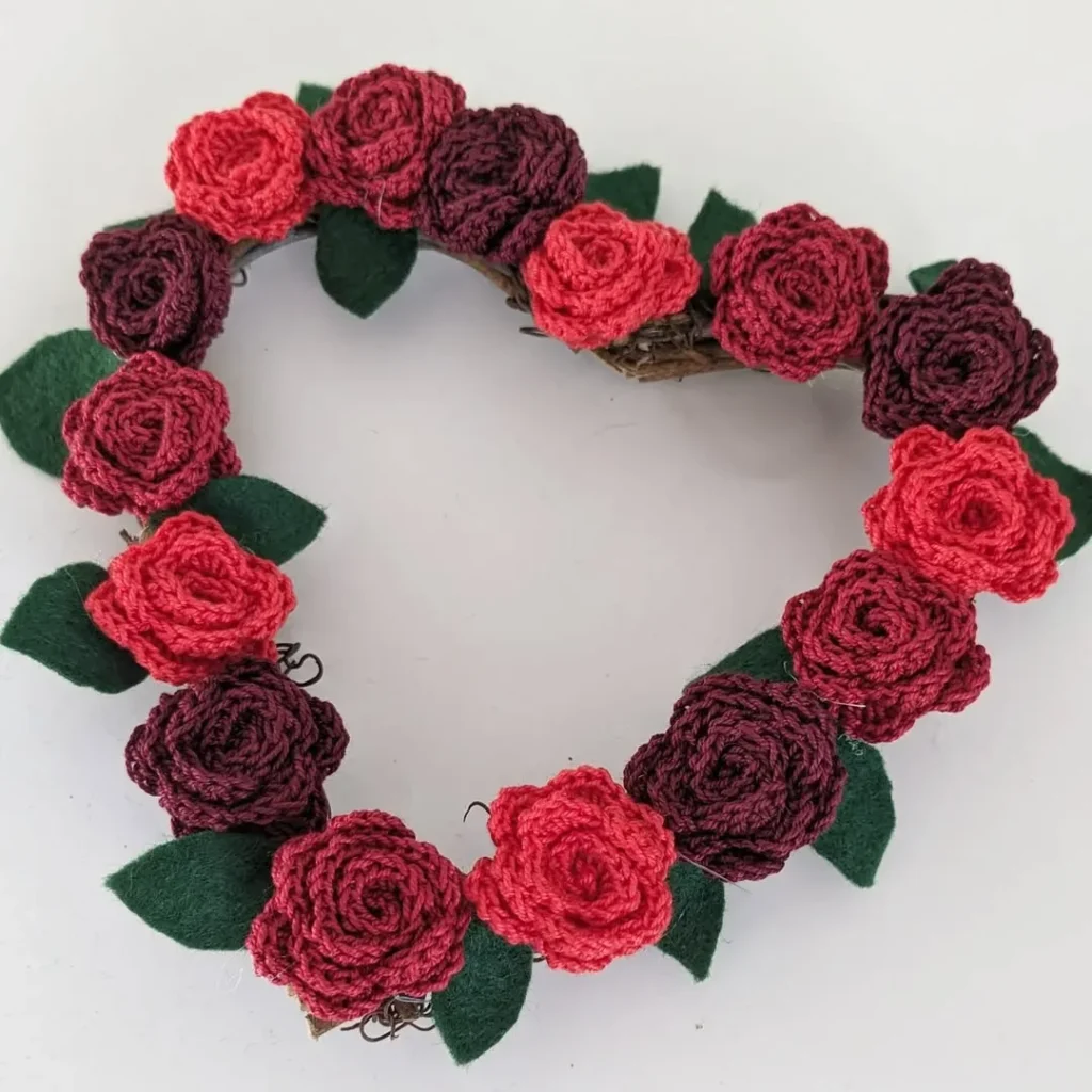 Crochet rose flower crowns add charm to small crochet gift ideas with a soft handmade touch. Rich red and deep burgundy roses create a romantic and eye catching look. Each flower shows careful stitching that highlights texture and detail.