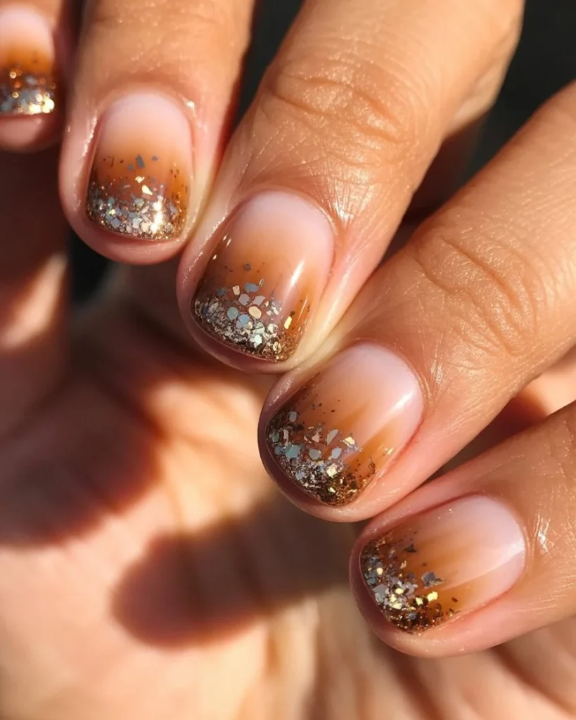 Think of a glass of iced coffee. Apply a transparent, coffee-toned jelly polish as your base. You should see a hint of your natural nail underneath. Then, using a makeup sponge, dab a glitter polish onto the tips. Choose a glitter with small, holographic silver and gold particles to mimic melting ice.