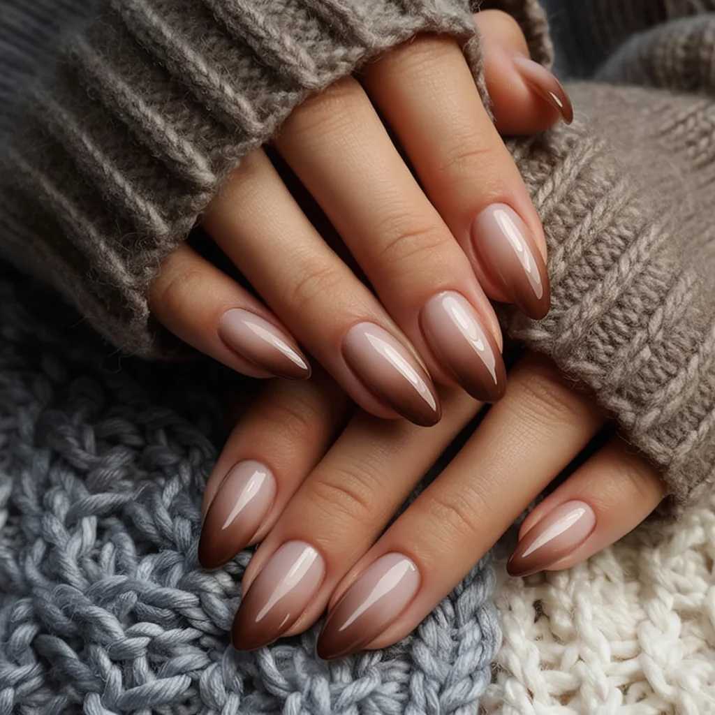The warm sweater in the background adds comfort to the overall mood, making the nails appear even richer. This design fits anyone who loves subtle coffee shades with a modern twist. It works beautifully for daily wear, yet still brings a touch of chic sophistication to any outfit.