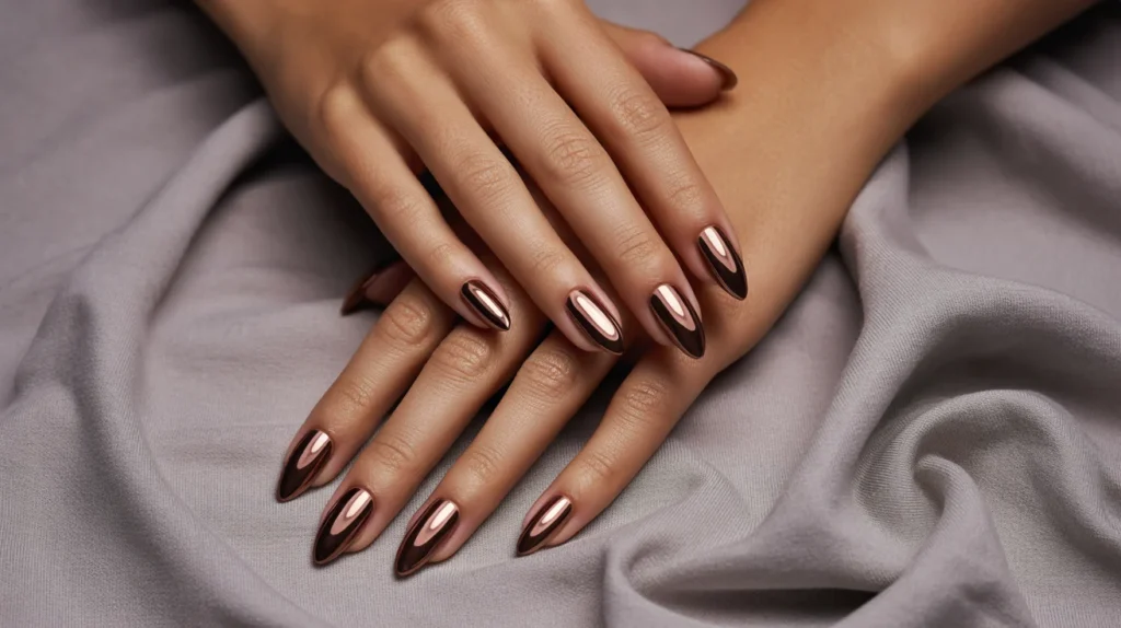 Soft metallic coffee nail design for chic style feels effortlessly elevated with this rose-mocha chrome manicure. Each almond-shaped nail carries a glossy metallic sheen that blends warm coffee tones with a soft rose reflection, creating a rich, luxurious finish. The smooth mirror effect adds depth, while the elongated shape enhances the graceful, feminine look.